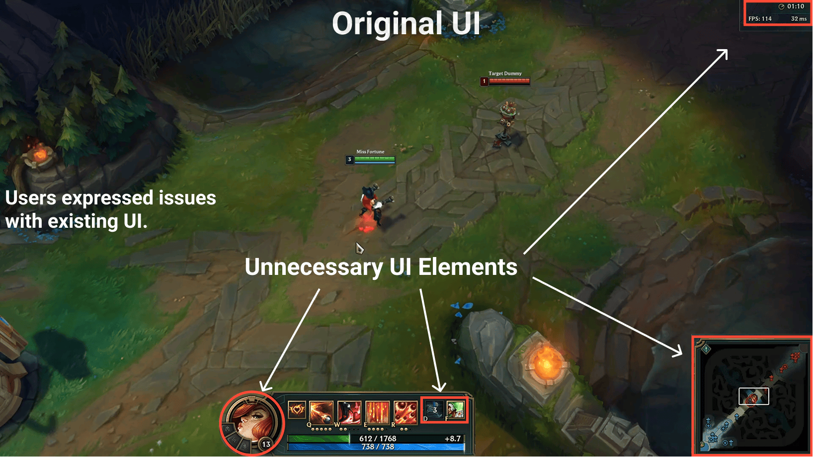 I tackled League of Legend's notoriously steep learning curve through a tutorial redesign. My prototype identified key friction points such as cognitive overload and insufficient feedback through cognitive walkthroughs and heuristic analysis. By simplifying the UI and breaking down complex mechanics into guided, interactive tasks, the redesigned experience successfully reduced task completion times, lowered error rates, and significantly improved gameplay comprehension for novice players.